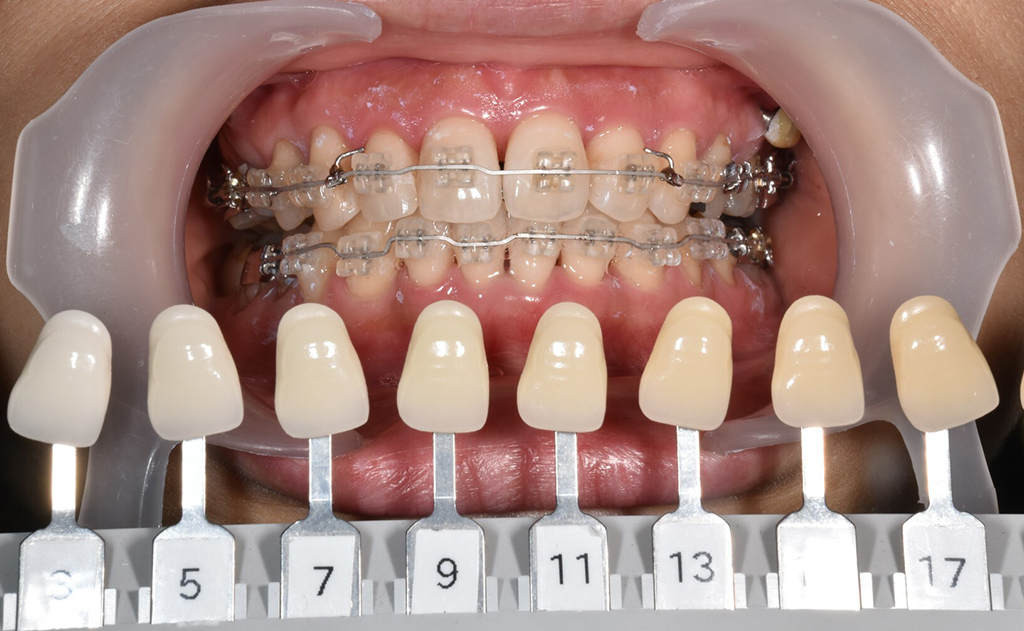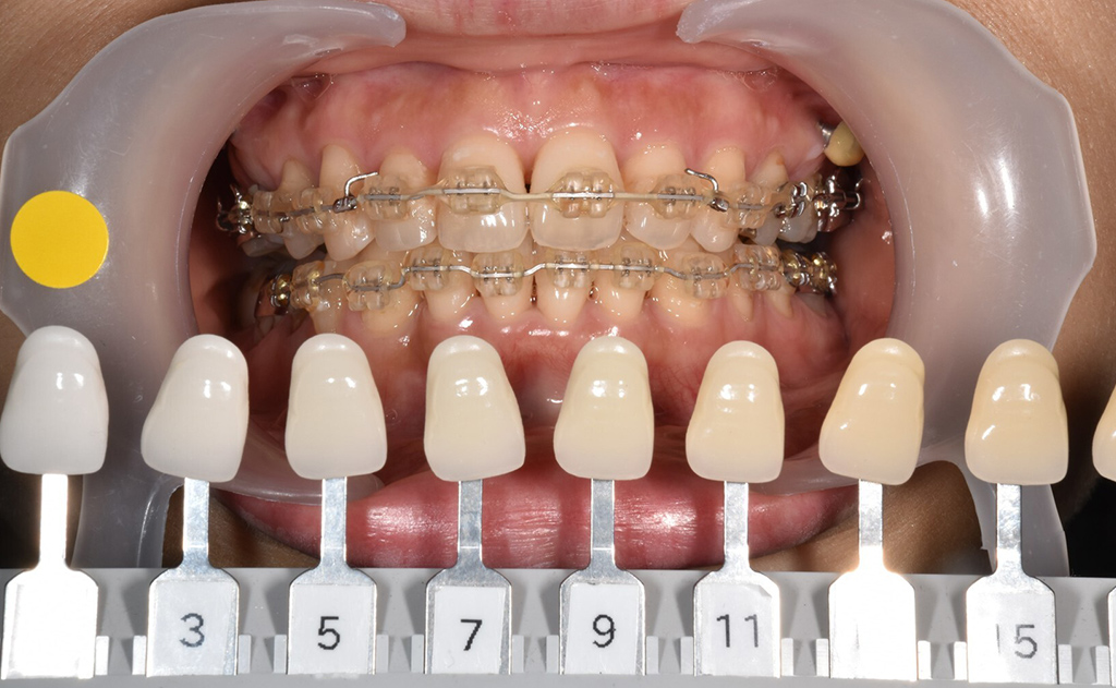 診断・状態 矯正治療中でブラケット装置を装着しており、装置周囲の黄ばみや歯の色調が気になる状態でした。